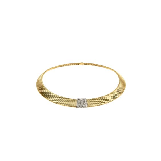 Collana elastica con maglia in Tubogas oro giallo ed elemento centrale in oro bianco e diamanti per 1,50 ct. Design moderno lucidato a specchio. Una collana dallo stile classico moderno perfetta per valorizzare il decollètè.