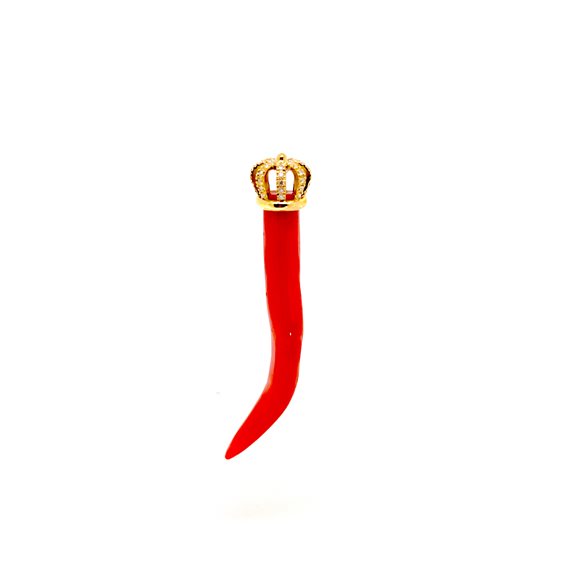Corno in Corallo Mediterraneo con Corona in Oro Giallo 18 Carati e Diamanti, un gioiello unico che unisce la potente simbologia protettiva del corno napoletano alla preziosità del corallo rosso del Mediterraneo, celebre per la sua rarità e il suo colore intenso. Incastonato in una maestosa corona realizzata in oro giallo 18 carati e impreziosito da brillanti diamanti di prima qualità, questo ciondolo rappresenta un’icona di eleganza, portafortuna e raffinatezza artigianale italiana. Perfetto per chi cerca un accessorio dal valore simbolico profondo e dal design esclusivo, ideale da indossare quotidianamente o da regalare in occasioni speciali.