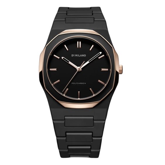 Un esperimento tra il minimalismo monocromatico e l'inaspettato per offrire un orologio dal carattere innovativo e senza tempo. Una tavolozza di colori monocromatici neri mescolati con un rivestimento in oro rosa che conferisce alla lunetta un aspetto premium e sofisticato. Il nostro classico Policarbonato, arricchito dalla finitura smaltata della lunetta, lo rende ancora più vicino al concetto di accessorio di design.
