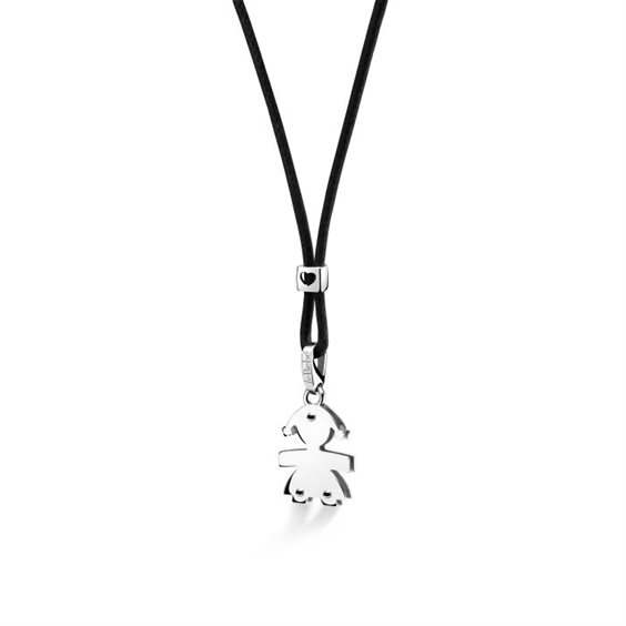 Ciondolo con sagoma femminuccia in oro bianco , altezza 1,40 cm. larghezza 1,20 cm., cordino color nero e distanziatore in oro bianco con cuoricino traforato.