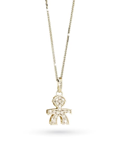 I PAVE PICCOLI.MASCHIETTO ORO GIALLO 18KT CON PAVE DI BRILL. CORREDATO DI CATENINA INORO.ALT CM 1,40.LARG. CM 1,20BRILL.CT O,17.PERSONALIZZABILE CON INCISIONE NOME O INIZIALE.
