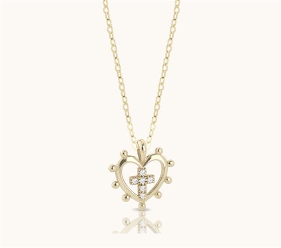 Porta il tuo cuore Sacro e la tua fede sempre con te con questa collana in oro 18 kt. Il ciondolo a forma di cuore Sacro e croce in diamanti bianchi da 0,03 kt è perfetto per la nuova collezione Cuore Sacro, con nuove forme uniche e un design elegante. Un prezioso e significativo accessorio per ogni occasione. • MATERIALE: Oro giallo 18 kt • CIONDOLO: A forma di cuore sacro e croce di diamanti bianchi da 0,03 ct G-VS • COLLANA: Realizzata in oro 18 kt