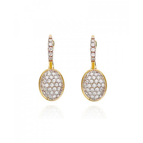 Due "ciliegine" in diamanti abbracciate dall’oro 18kt inciso a mano, capolavoro di artigianato artistico e di creatività. Misura orecchino: 8,2 mm x 21,20 mm Ref. OS25-583 DIAMANTI: - Peso (totale): 0.58 CT - Purezza: VS - Colore: G - Taglio: brillante rotondo