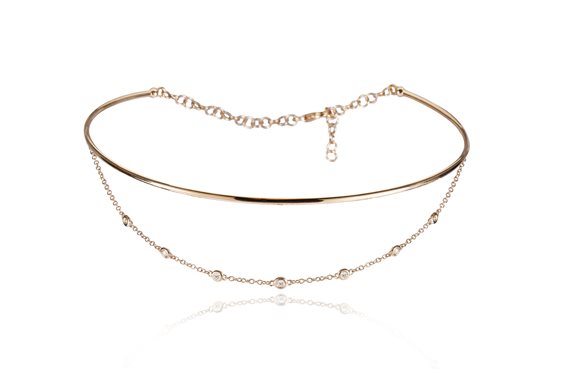 Choker doppio. Il primo Choker rigido in Oro 18ct. Il secondo e una collana con sette diamanti taglio brillante e una chiusura regolabile.