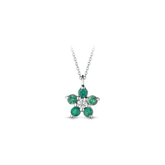 collana in oro 18k con pietra smeraldo. Collana con piccoli fiorellini in oro bianco e diamanti. Purezza diamante: VS Carati pietra: 0,016 Colore pietra: G