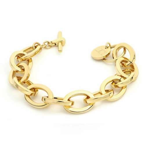 UNAERRE FASHION JEWELRY Bracciale a catena bold, maglia ovale squadrata (dimensione elemento maglia 2 cm) con galvanica oro giallo. Chiusura T bar, possibilità di inserire la chiusura anche nelle maglie. Gioiello anallergico, nichel free Made in Italy